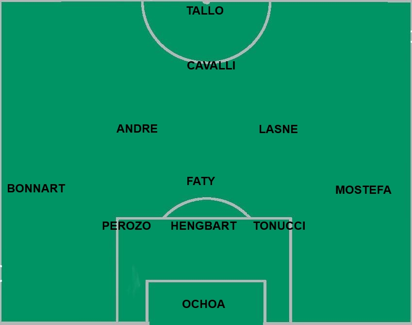 Pas de surprises pour la composition de la part de Christian Bracconi. Si les médias annoncent un 4-5-1, c’est bien un 5-4-1 au début de la rencontre avec Mostefa et Bonnart placés très haut. Tellement haut que la composition sera vite un 3-5-1-1. Au milieu de terrain, Ricardo Faty retrouve sa place de sentinelle avec Lasne et André autour de lui. En meneur de jeu, c’est également le retour de Johan Cavalli alors qu’en attaque, Tallo est préféré à Oliech. Mais les blessures ont contraint Christian Bracconi à revoir sa copie. Avec les sorties de Bonnart et Hengbart, et vu la physionomie du match, le 5-4-1 s’est transformé en 4-5-1 avec une défense Mostefa, Perozo, Tonucci, Dielna, de droite à gauche.