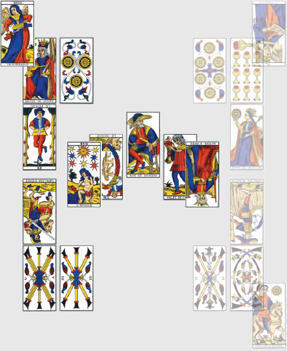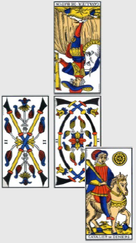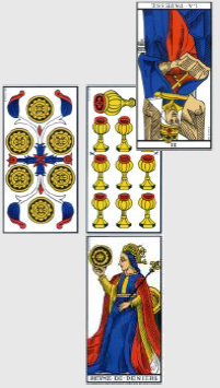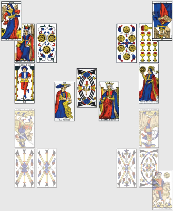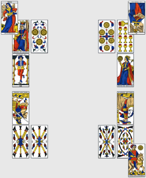 Ce dernier match, ultra décisif, doit sceller le sort de la France et du Honduras, celui de l’Équateur n’intéressant déjà plus personne. Vous aurez beau m’accuser de parti pris, force est d’admettre que je suis contraint de tirer deux nouvelles cartes pour réifier la lecture : la physionomie du match est sous le signe du 9 de Coupe inversé, qui met en garde contre l’arrogance et la paresse qui pourraient empêcher la complétion promise par le 9 d’avoir lieu. À part un match abandonné par des Équatoriens qui n’ont plus rien à jouer, cela semble hors de propos. Les deux cartes restantes du trio sont carrément absconses dans ce contexte, puisque la Reine de Bâton de l’Équateur désigne une femme chaleureuse, sociable, ou des œuvres caritatives (s’agit-il d’offrir le match à l’équipe de France, encore une fois?), alors que le 4 de Deniers à l’envers est une carte qui ne jure que par l’argent : l’argent obnubile, rien n’est assez bon. Certes. Mais c’est sans rapport avec le match, on n’a pas assez d’information et la carte de physionomie n’éclaire pas la performance de la France.
