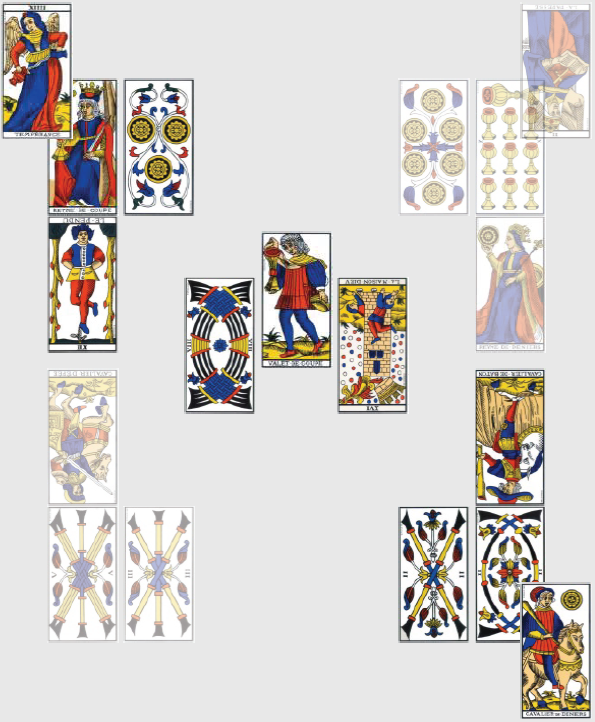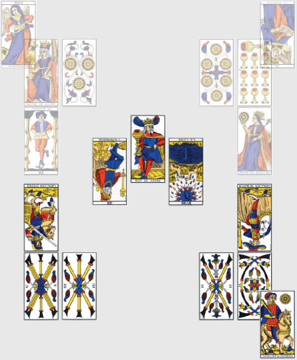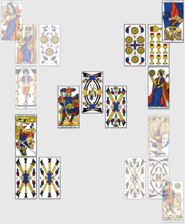Mais ce combat d’infirmes doit bien donner lieu à un résultat, et il semble être plutôt en faveur du Honduras : le 4 de Bâton à l’envers tiré par l’Équateur amorce une période d’attente, et confirme la nécessité de prendre une pause, que l’Équateur fera à n’en pas douter loin de ses bases brésiliennes. Puisqu’il faut tout expliquer, il sera éliminé à l’issue du match, donc perdra. Le Roi de Bâton n’évoque pas grand-chose, c’est a priori un bonhomme énergique, plein de vitalité et d’idées, amusant mais sur qui on ne peut pas trop compter. Il désigne, sans grande conviction, un joueur Youtube du Honduras qui tournera autour du but, à force de gri-gri spectaculaire, sans la mettre au fond. Comme les gros membres en boîte de nuit, à l’époque où on ne les recalait pas à l’entrée systématiquement.
