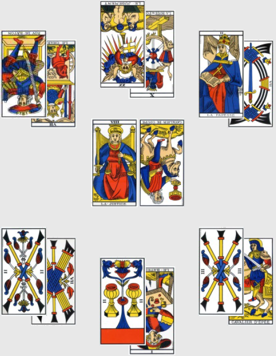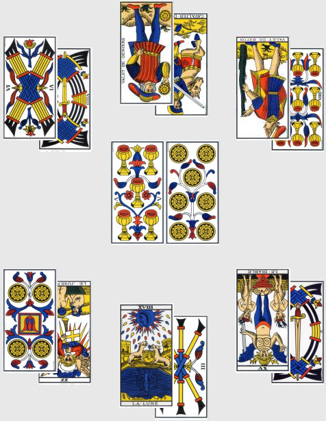 Ce dernier quart d’heure n’est pas non plus aisé à interpréter, mais étant un taromancien accompli, c’est parti mon kiki : le Jugement inversé signifie qu’une décision est prise trop tardivement, et que cela a des conséquences lourdes (encore un joueur blessé ?), ou bien une grande peur de la mort et du changement (on se rechie dessus, les Brésiliens ?). Le 4 de Deniers inversé est quant à lui la carte d’avarice et d’insatisfaction par excellence, on n’est jamais content si on la tire. L’Allemagne ne marque pas, le Brésil passe, on en casse la télé, mais une petite lueur d’espoir reste puisqu’il n’est pas impossible qu’un joueur important manque à l’appel en finale.