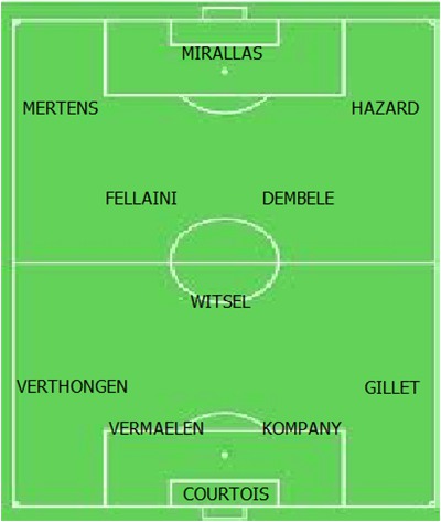 Chez nous, Marc Wilmots a repris certaines bases du match contre les Pays-Bas. Ainsi, Courtois est bien installé dans les bois, la paire (et quelle belle paire) Vermaelen-Kompany est reconduite, et Wilmots profite des bonnes perfs de Verthongen à gauche et du replacement de Gillet à Anderlecht au poste d’arrière droit. Au milieu, Witsel et ses 40 millions de boules est placé devant la défense, tandis que Fellaini et Dembélé s’occupent d’attirer les ballons dans l’entrejeu. Devant, les « Schtroumpfs » (coucou à Sharkfoot) Mertens et Hazard sont là pour faire bouger la défense galloise et enfin Mirallas est placé en pointe.