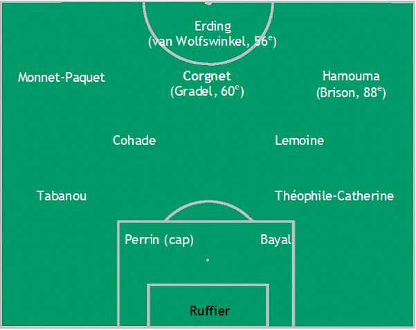 Clément se vidant par tous les orifices depuis son retour de Turquie, Galtier envoie donc son 4-2-3-1 avec Corgnet à la baguette. Sinon, 1e titularisation pour KTC sur le flanc droit de la défense à la place de Brison et KMP a été préféré au fils de Dieu sur le flanc gauche, ce qui fait qu’on aura donc 2 recrues titulaires. Par contre, toujours pas de RvW qui squatte le banc stéphanois. Pour combien de temps ?