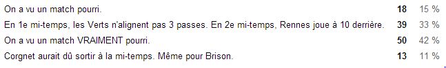 Bon, ben sans conteste, avec 42% des suffrages (comme un symbole), on est d’accord pour dire qu’on a vu un match VRAIMENT pourri. Après, le déroulement du mâche avec 2 mi-temps infâmes à leur manière a fait aussi une belle recette. Par contre, une minorité partage mon avis sur Corgnet finalement. A votre disposition pour en discuter en commentaires.