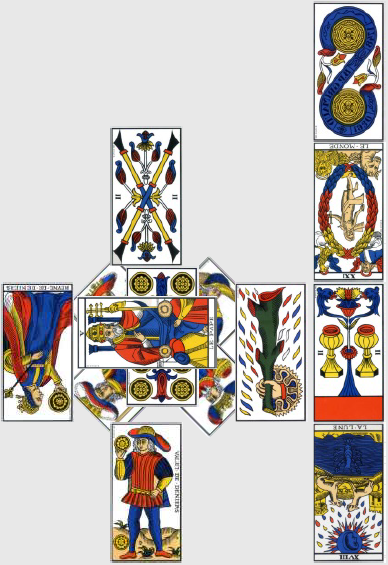 Deux remarques préliminaires : il y a quatre Rois dans le tirage (ah tiens), dont les effets conjugués présagent pour Zidane des honneurs publics, des rassemblements fédérateurs, et de grands succès dans les affaires politiques ou le business. Nul besoin de lire dans le futur pour s’en rendre compte, le passé suffit me direz-vous, mais hé ! soyez heureux que ma science confirme votre bon sens (souvent déplorable). De plus, il y a beaucoup de Deniers (cinq, comptez le Roi et la Reine), donc les caractéristiques de cet élément (pragmatisme, argent, voluptés terrestres…) auront beaucoup de poids.
