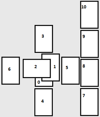 Je l’ai expliqué ici, et très très bien, magnifiquement même. Les cartes sont disposées ainsi (suivant la numérotation de l’article précédent), dans une audacieuse formation en 4-1-4-1-1 que les excellents Dé-Managers (un occultiste ne peut que les recommander vu qu’ils prient Guardiola, ce démon qui nous sert d’intermédiaire à Satan lorsqu’on vend notre âme) ne renieraient pas :