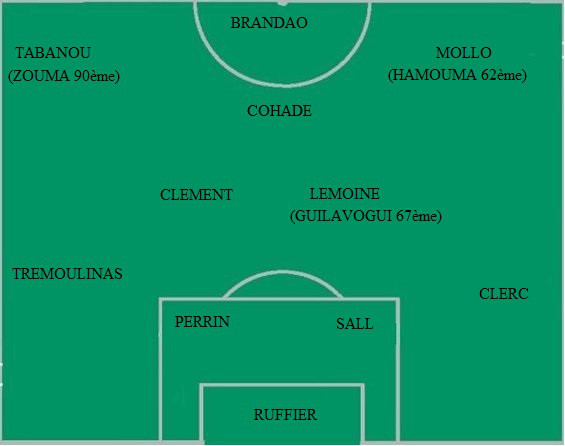 Sans surprise Clerc retrouve une place de titulaire après la prestation indigeste de Zouma, Cohade reste en place car Corgnet est blessé (3 semaines d’arrêt) et Mollo prend la place de Hamouma, alors soit c’est pour faire souffler Romain (on le sent un peu fatigué) soit c’est pour le punir de ses dernières prestations (sans doute dues à la fatigue). Le reste est classique. On surveillera avec attention la prestation du côté gauche avec la paire Tabanou/Trémoulinas qui semblent se trouver de plus en plus.
