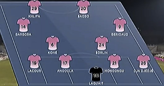 Retour à un système qu’on maîtrise et de deux défenseurs centraux précédemment, autant dire que je me sens plus serein. Laquait n’a aucune raison de perdre sa place actuellement. A gauche, Wass est « malade », sûrement après avoir revu son match contre Paris qui m’a moi-même fait vomir. Koné quitte la défense centrale grâce au retour d’Angoula et pousse Rabiu sur le banc. Bérigaud prend l’aile droite, Govou étant « mis au repos ». Barbosa à gauca he, Khelifa – Sagbo en pointe, notre attaque type est alignée pour la première fois depuis un moment.