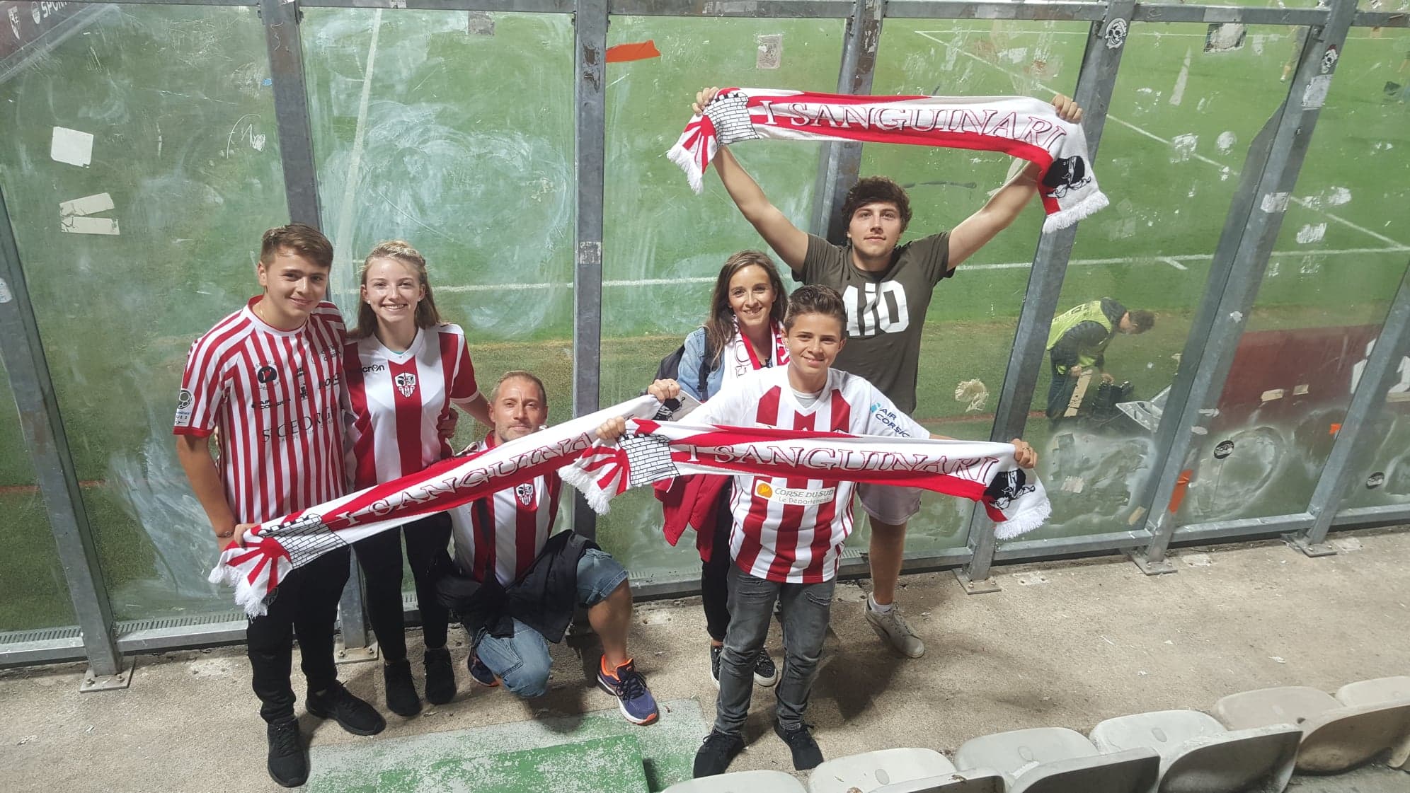Après le coup de sifflet final, malgré la défaite, la plupart des joueurs acéistes sont venus nous saluer, de plus ou moins loin, comme depuis le début de saison. Ça change et c’est fort agréable (décidément, c’est un mot que j’aurais beaucoup utilisé aujourd’hui). À la fin, avant de débâcher, je vais donner une poignée de boulons et de rondelles que j’ai trouvé sur des sièges du parcage au stadier pendant que la famille de Jean-Luc ramasse les déchets de la soirée. Le stadier n’en revient pas et est à deux doigts de nous sucer la bite. Il nous dit « Si tout le monde était comme vous, ce serait génial, c’est pas le Pérou ». Bon ok, cette expression n’a aucun sens dans cette phrase, mais c’est quand même ce qu’il a dit. Super sympa, mais pas un génie, ce mec. On le remarquera ensuite lorsque je lui demande de nous prendre en photo.