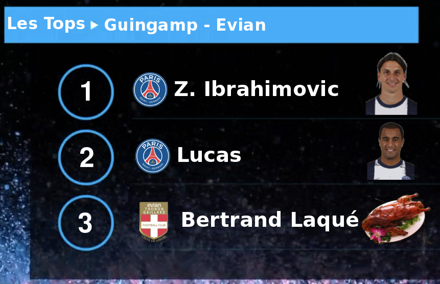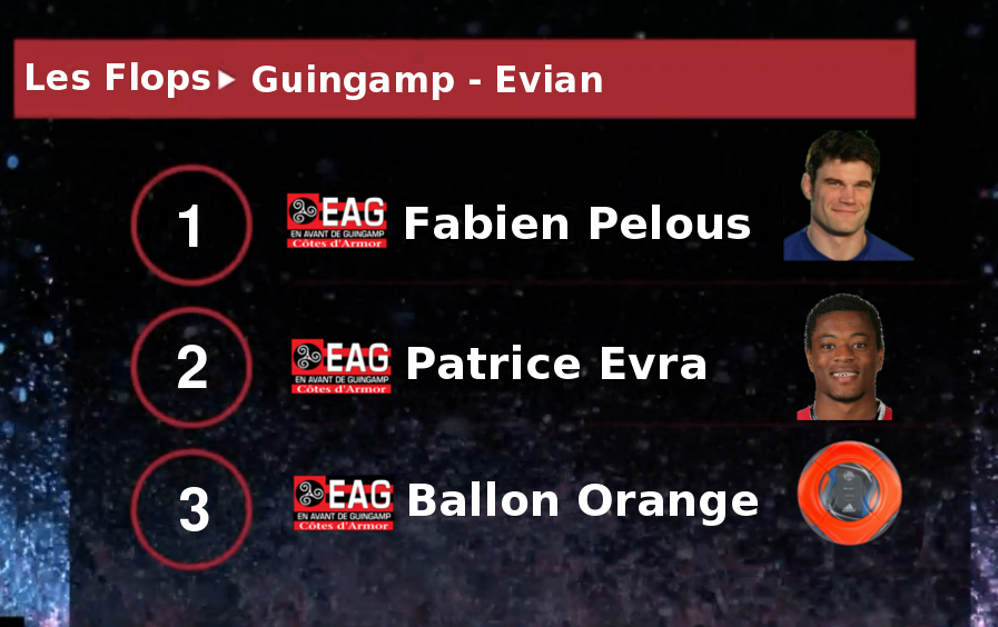 – «C’était la semaine dernière Pierre, mais je pense que tu fais ça pour taquiner les Guingampais. Tu veux nous faire croire que tu n’as pas regardé le match. Ahah je vois c’est pas mal. Nan par contre, la troisième on peut pas te laisser la faire, il ne jouait même pas en plus. Passons maintenant aux Flops Pierre si tu veux bien.»
