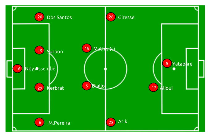 Grosse surprise pour ma part, Alioui est titulaire. Les absences de Mandanne et Douniama ainsi que sa bonne entrée en coupe en milieu de semaine n’y sont pas étrangers. Dos Santos, malgré des performances moyennes à ce poste, s’occupera du couloir gauche étant donné les absences de Lévêque et Lemaître.