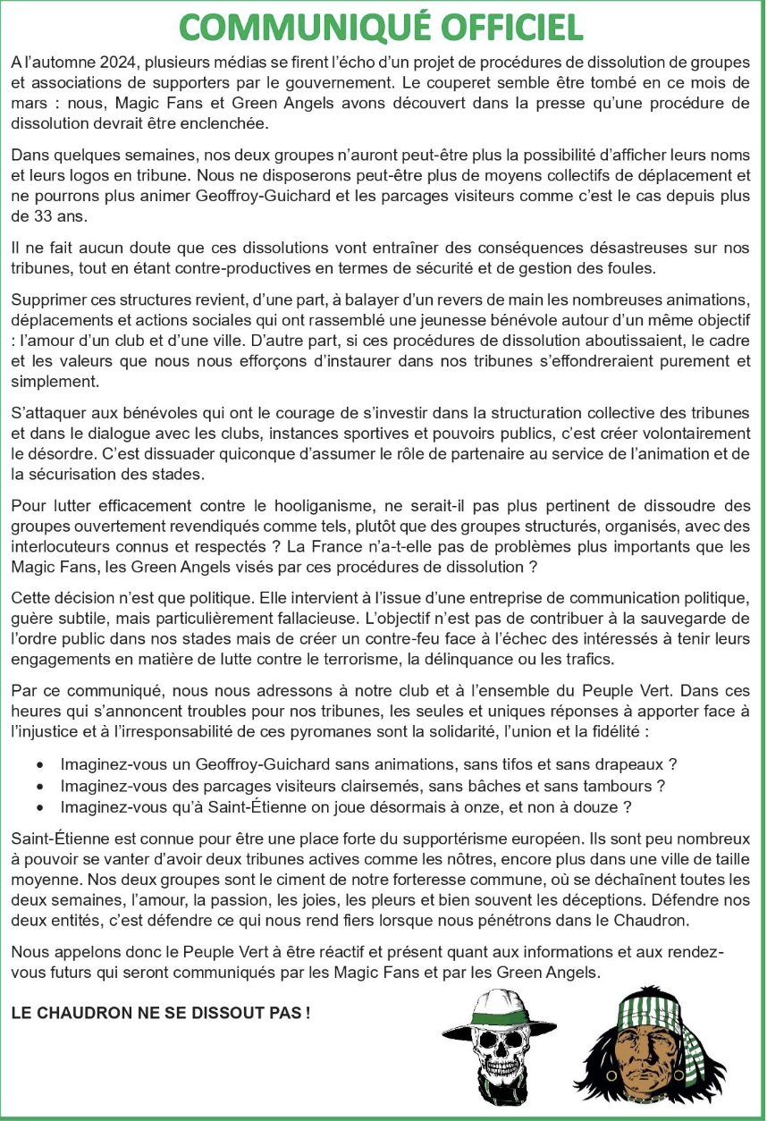 Et pourtant tout avait bien démarré… Cardona mange la feuille dès la 6e minute mais finalement, c’est bien Sainté qui ouvre le score grâce encore une fois à Stassin (0-1, 10e). Deux minutes plus tard, Cardone double la mise mais voit son but annulé par le VAR après une revue plus longue que le CV de Xavier Gravelaine. Le Havre est remis dans le mâche et va donc se procurer les meilleures occasions jusqu’à ce contre de volley dans la surface parfaitement effectué par Bouchouari. Penalty logique mais très mal tiré par Touré, Larsonneur repousse dans ses pieds, et il ne loupe pas sa 2e chance (1-1, 45e). La deuxième mi-temps sera plus ennuyeuse, peu d’occasion de chaque côté mis à part ce coup-franc de Zounaoui pour Le Havre, dans les dernières minutes, qui passe de peu à côté. Mâche nul qui n’arrange pas grand monde, mais qui ne déçoit personne. Un petit mot quand même pour cette nouvelle qui fait froid dans le dos : la dissolution voulue par le Ministère de l’Intérieur de plusieurs groupes de supporters en France serait bien sur les rails, et évidemment les Magic Fans et les Green Angels font partie des « heureux élus ». Une mauvaise nouvelle de plus dans une saison qui n’a vraiment rien d’une partie de plaisir. Soutien aux groupes : le Chaudron ne se dissout pas !
