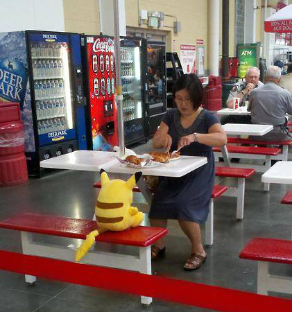 Choqué par cette attitude défaitiste, je suis rentré comme un seul homme dans mon costume et c’est en Pikachu que je débarquai au rez de chaussée pour motiver les troupes. Malheureusement, l’équipe venait juste de partir pour prolonger la séance de footing dans l’immense parc de l’hôtel et je dus me résoudre, après 20 mn de course harassante, à retourner dans le hall afin de les accueillir au moment du déjeuner.