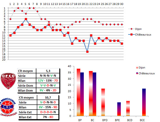 5 matches sans défaite, 4ème équipe à domicile, Dijon a les cartes en main pour profiter des faux pas de ses concurrents ce weekend. Pour bonifier ces 4 nuls qui font malgré tout peu avancer. Car Châteauroux, c’est aucune victoire en déplacement et une 19ème place à l’extérieur. Un match « bonus » dans la quête du maintien.