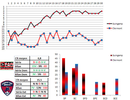 Encore un match entre bien et mal classé, et Guingamp peut réitérer sa bonne opération de la 30ème, au cours de laquelle ils ont regagné le podium, puisque les affrontements Angers-Nantes et Le Havre-Caen sont susceptibles de bien ralentir les concurrents. A eux de ne pas laisser filer leur chance, et de profiter de leur bonne attaque à domicile, et de la défense clermontoise plutôt friable. Méfiance tout de même car si les Clermontois ne sont pas sur une dynamique olympique, ils n’en sont pas moins la 6ème équipe à l’extérieur.