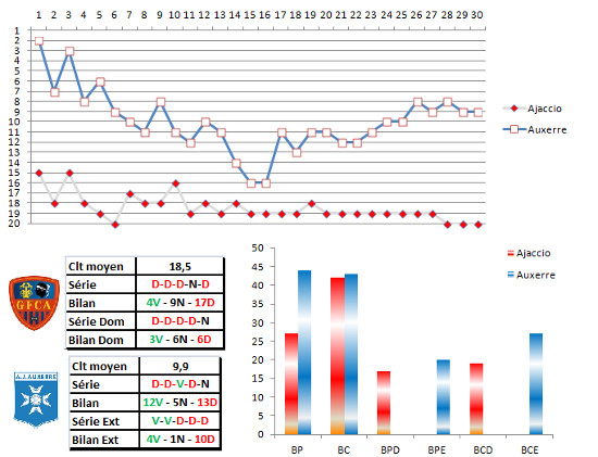 En bas du tableau, toujours nos 3 équipes à l’agonie : Ajaccio, Sedan et Le Mans. 0 point pris et c’est la ligne rouge qui monte inexorablement, puisque Niort et Clermont ont eux réussi à prendre les 3 points. Arles Avignon, malgré un bon point obtenu chez les Caennais, glisse à la 17ème du fait des victoires des autres menacés. Enfin, Tous s’apprêtent à passer le point mort, en atteignant les 38 points après sa nouvelle victoire à domicile. On respire également côté lavallois après la victoire face au voisin manceau.