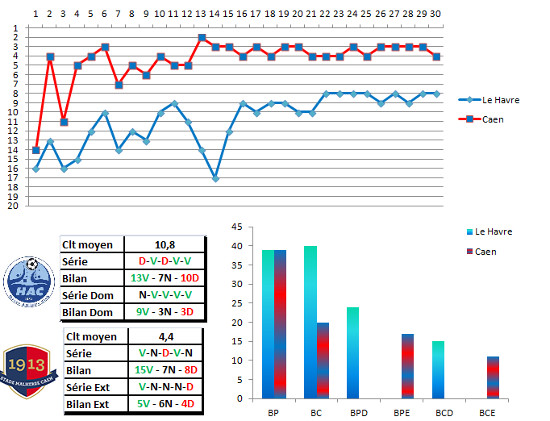 Duel normand à l’horizon. Des havrais sur une série impressionnante à domicile, qui leur a permis d’espérer à la montée, en cas de circonstances favorables. Circonstances à provoquer puisque la réception du 4ème constitue un vrai test. Et ce pour les 2 équipes, qui vont devoir montrer si elles ont suffisamment de tripes pour passer à l’échelon supérieur. Un nul, sans être catastrophique, ne satisferait aucune des 2 équipes avec d’un côté le retard havrais, et de l’autre un calendrier de haute montagne pour les caennais : Lens, mais surtout Angers, Dijon, Monaco puis Nantes…