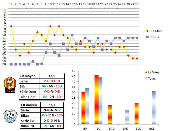 La perspective d’évoluer en National prochainement, à cause du sportif, est évidemment loin d’arranger les affaires mancelles. Ils ont pris 2/3 de leurs points à domicile, et seraient bien inspirés d’ajouter une victoire à leur tableau. D’autant plus que Tours est quasi-maintenu désormais et se révèle être catastrophique en déplacement, avec une moyenne de plus de 2 buts encaissés.