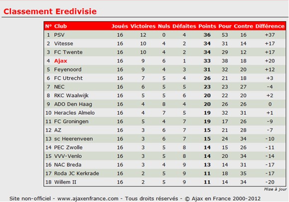 Victoire 2-0 sans forcer, reposante pour les joueurs et les nerfs des supporters. L’Ajax cravache pour revenir sur la tête et est pour une fois, en bonne position pour ne pas manger la dinde de noël avec 10 points de retard sur le leader.