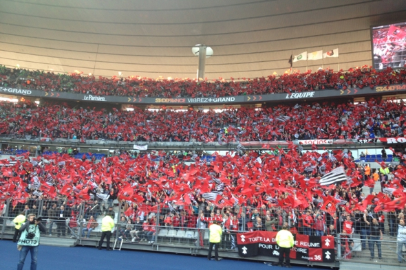 La journée était pourtant bien partie. Temps ensoleillé, maillot rouges-et-noirs abondant dans le métro, grosse ambiance aux Sports, où l’on pouvait même acquérir quelques galettes-saucisse qu’on aime, on en mangerait des kilos… A l’extérieur du bar, les supporters acclament le petit bonhomme rouge du feu pour piéton, et conspuent son homologue vert. C’était une belle journée, où l’on espérait tous qu’on allait faire chier la France entière, sauf Lyon et le Corse, en privant les Verts d’un titre pas bien joli, mais qu’ils voulaient tout de même. C’est une fois rejoint dans le métro par plusieurs litres de Ricard que la journée s’embrume un peu. La vague rouge sur la ligne 13 fait face à la marée verte fièrement. Celle-ci s’étonne de découvrir des vrais supporters rennais. « On savait à peine qu’on vous existiez les mecs ». Et si, on est là. On est là, on est là, on est là. Peu importe le résultat, nous, on est là. Pour l’amour du maillot, que l’on porte sur les deux, on est là, on est là, on est làààààààà.