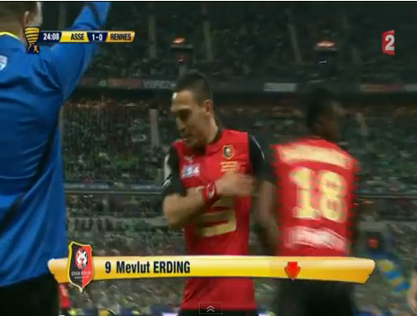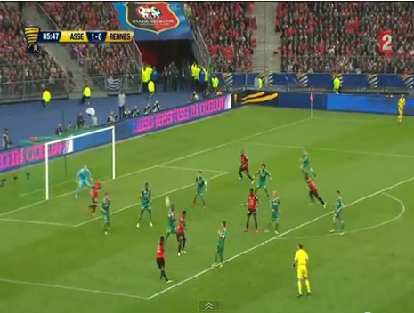 Après une rapide présentation des équipes à Thiriez-Thiriez-va-te-faire-enculer (mais peut-être ne demande-t-il que ça ?), le match venait tout juste de commencer que Pitroipa décale Erdinç/g dont la frappe contrée par Brison n’était pas loin de faire mouche(et pas à merde, on tient à le préciser au cas où de nouveaux supporters parisiens voudraient nous faire part de leur susceptibilité) sans un joli arrêt réflexe de Ruffier. On ne le savait pas encore, mais c’était probablement le tournant du match. A la première minute du match, comme un symbole de cidre de Cornouailles. Dans la foulée, Clerc colle une jolie volée sur corner, mais Costil réussit parfaitement son arrêt du regard. On joue depuis seulement 2 minutes et le match est déjà emballé avec une grosse occasion de chaque côté. La finale s’annonce prometteuse.