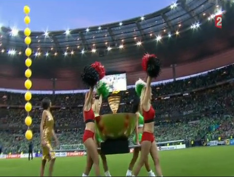 Habile faiseur de spectacles, la LFP avait organisé un très beau déploiement de panneaux contreplaqués peints assemblés de manière à former les SRFC et ASSE, le tout apporté sur la pelouse par des nanas en tutus. Comme un symbole, l’une d’entre elles qui apportait la première lettre du sigle rennais s’est pris les pieds dans le gazon et s’est vautré comme une merde. Drôle de présage…