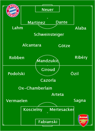 En première mi-temps, la théorie des tentatives de contre se confirme. Bien que je pense que dans l’intention Arsène ne voulait pas que son équipe laisse le ballon aux allemands, ses joueurs ne sont pas vraiment en mesure de faire le jeu face à ce Bayern, qui affirme son statut une fois de plus. Toutefois la défense tient bon sans paniquer, et les contres sont dangereux. Les Gunners sont combatifs mais manquent de précision dans les relances, ce qui ne facilite définitivement pas leurs affaires, permettant au Bayern de conserver la domination territoriale.