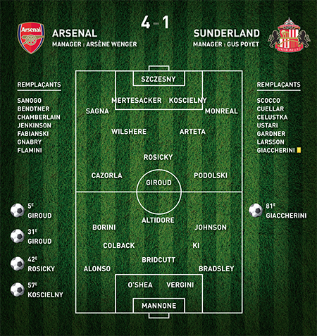 C’est une constante cette année : Arsenal cogne les petits. Oui, on sait, c’est moche, mais Tonton a semble-t-il réalisé que ces petits matchs de pouilleux faisaient aussi les champions. Alors maintenant, on tabasse les faibles, en particulier à la maison. Voilà, là c’est Sunderland qui a pris le tarif, mais y’a rien de personnel. C’est une sorte de politique de base cette saison, et puis en plus, ils passaient derrière le Bayern, ils ont servi de défouloir. Quasiment 70% de possession sur le match, 3-0 à la mi-temps, les Gunners ont mis les formes dans ce résultat. Certes, la deuxième période a été un poil moins sereine, les Black Cats ajoutant du poids devant et renforçant leur pressing, mais avec une défense Bob le Bricoleur, l’entrée de Flamini à gauche, de Jenkinson à droite et le passage de Poulpy dans l’axe, on pouvait s’y attendre. C’est point grave. Reste que le double pivot Wilshere – Arteta me semble être un peu limite pour des équipes de plus gros calibre. Ca se fait transpercer de tous les côtés à la moindre contre-attaque.