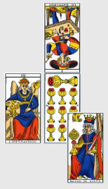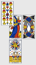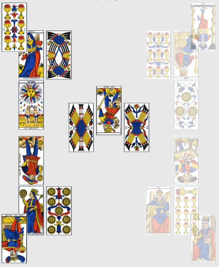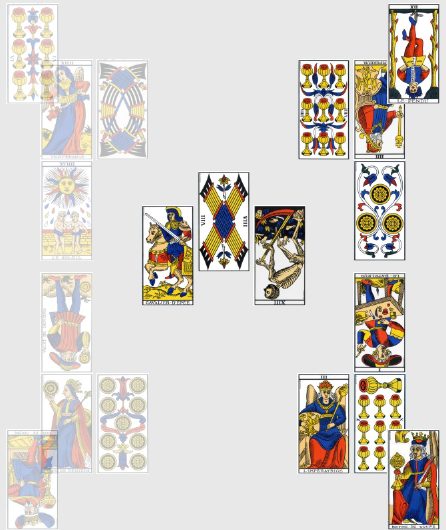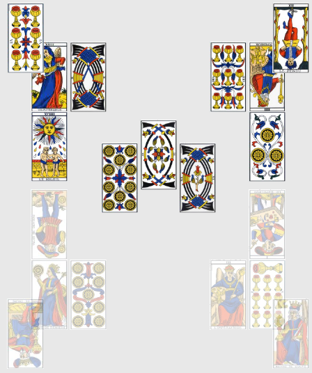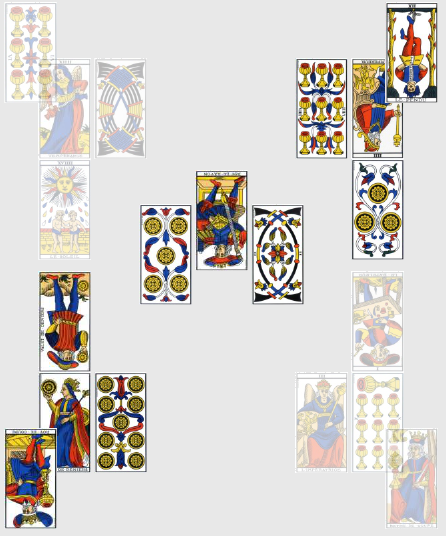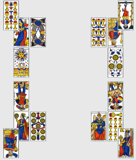 Contrairement au match précédent, celui-ci est presque dénué d’intelligence tactique ou de collectif digne de ce nom, le Roi de Bâton inversé étant un être à la fois égoïste et étroit d’esprit. L’Algérie n’ayant plus pour seule mission que sauver l’honneur, ils y travaillent dur et cela paie ! Le 5 de Deniers inversé augure d’un rétablissement après une période difficile, la pente ascendante est amorcée. Enfin, la Russie hérite de l’omniprésente carte du 2 d’Épée inversé, sans doute ici à interpréter comme un signe de tension ou l’inquiétude de faire jeu égal avec une équipe réputée la plus faible du groupe, ce qui devrait en plus engendrer pas mal de mesquineries de leur côté… Bon allez, la prime au mérite, je mets 2-1 pour l’Algérie, ils rentreront à la maison fièrement.
