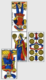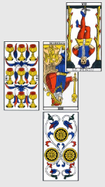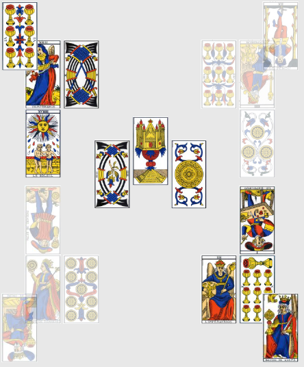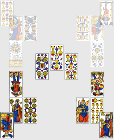 Tonton Vladimir ou Fabio Capello ? En tout cas, une personne puissante représentée par l’Empereur inversé contrôle le destin de la Russie, et pas vraiment en leur faveur. Ceci dit, l’équipe elle-même est en forte progression niveau force et créativité comme le 3 de Deniers nous l’indique (carte vue et revue). Ensuite, le 9 de Coupe signifie que leur point faible est… inexistant : j’ai beau chercher, cette carte est une vraie carte de Bisounours : moral au beau fixe, cohésion totale, joie et accomplissements. Tout a l’air de bien aller donc pour eux, à l’exception de la star choisie, qui n’est autre que Dzagoeff Dzagoef Dzagoev, qui se ramasse le Pendu : pas forcément si négative, cette carte suggère quand même de s’armer de patience et de savoir faire des sacrifices : le bonhomme sera donc vraisemblablement bridé dans l’organisation tactique de la Russie.