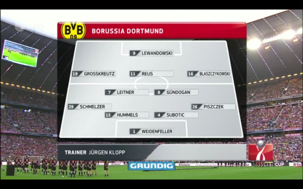 Les deux compositions, en image. On note qu’à Dortmund, il manque Kehl et Bender (à nouveau blessé), ce qui explique le duo Leitner-Gündogan.