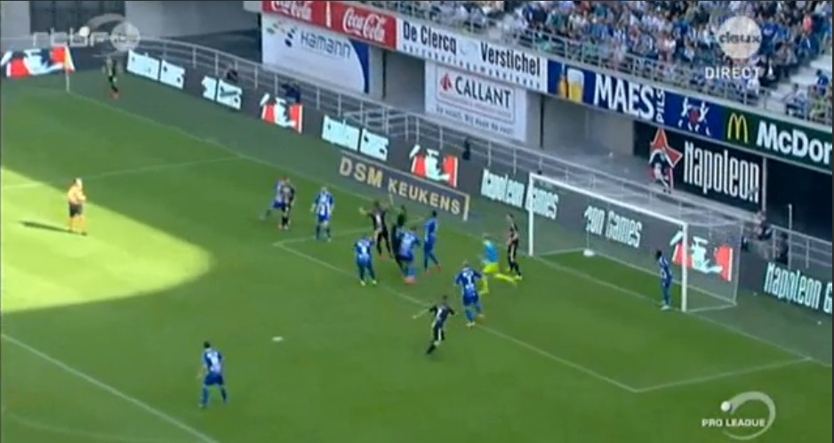 Et on continue avec les problèmes de maillot. Enfin, l’arbitre ne dit rien, mais bon, la ressemblance flagrante entre le maillot du gardien de Gand et les maillots de ses coéquipiers…