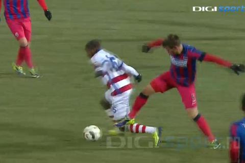 La première mi-temps a surtout été marquée par d’énormes d’arbitrages à l’avantage du Steaua. Piovacarri a d’abord sorti un tacle par derrière assez sale avant que Pintilii ne s’essuye les crampons délibérément sur le mollet d’un adversaire. Les deux s’en sont sortis sans carton alors que la deuxième action valait quasiment un rouge. Dans cette même première mi-temps, trois joueurs du Steaua ont touché le ballon de la main dans la même action dans leur surface sans que l’arbitre ne siffle… Et bien entendu le Steaua a ouvert le score en fin de première mi-temps.