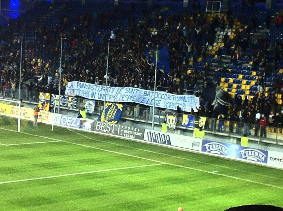 Banderole des supporters du Petrolul : « A Pungesti, des frères sont moqués, humiliés. Des tortionnaires en uniformes. De quelles lois parlez-vous ? »