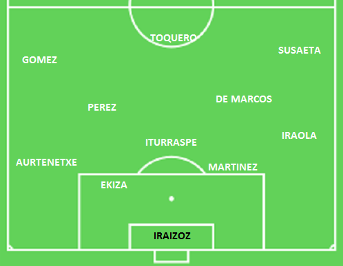 Une défense à quatre composée de la charnière Javi Martinez – qui reprend son poste de milieu de terrain sur les phases offensives – et Ekiza, titularisé pour laisser souffler l ‘habituel titulaire Amorebieta. Sur les côtés sont alignés le très convoité capitaine Iraola à droite et le méconnu Aurtenetxe à gauche.