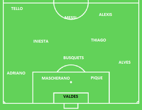Une défense à quatre avec la même charnière que face à Milan, Piqué-Mascherano et deux latéraux à vocation très offensive Alves et Adriano. La tignasse puyolesque est laissée au repos en vue du match contre Milan.