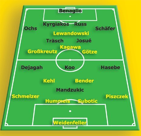 Weidenfeller (2/5) : Encore un match sans grandes encombres pour M. Weidenfeller. Mais une sortie au devant d’un joueur de Wolfsburg alors qu’il a encore deux défenseurs devant lui. Résultat : un but encaissé.