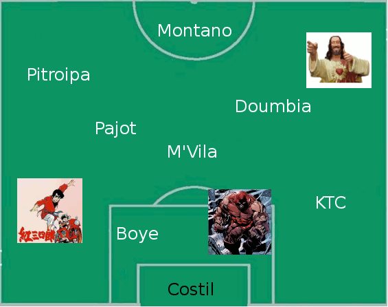 Alors Bordeaux, c’est quoi ? Un ancien boulémique dans les cages, auteur de la fracture de Jimmy Briand dont l’absence a empêché Rennes de gagner sa finale de coupe de France. En défense, on retrouve un candidat au ballon de plomb (Chalmé), ou un truc improbable côté droit (genre Sané) ; un axe de brutes vicieuses avec Henrique-Planus ; et enfin le sosie de Pépito côté gauche. Parfois pour la déconne, son entraîneur titularise Ciani, mais il aime pas trop la déconne en fait. Au milieu, on retrouve leur deux principales recrues estivales : N’Guemo et Maurice-Belay. Ça fait rêver personne mais/vu que ça coûte zéro euros. Pas de N’Guemo ce soir, suspendu, et c’est le jeune Sertic qu’on retrouve pour un 4-4-2 à plat. À leurs côtés on retrouve Jaroslav Plasil, principal joueur de football de l’effectif, et Fahid Ben Khalfalah, dont les supporters girondins parleront mieux que moi. Enfin, en pointe, il y a Bellion et Gouffran, mais ça pourrait aussi être Modeste, Jussiê ou Diabaté. Bref, ils auraient même de quoi nous envier notre duo de buteurs pas buteurs Hadji-Montano.