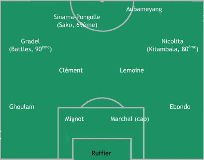 Du classique pour cette compo, mis à part le fait que Mignot, revenu de blessure / suspension, prend la place de Zouma en défense centrale. Galette continue de faire confiance à la paire Lemoine – Clément au milieu, Nicolita (« Nicolitsa » pour les commentateurs… Sans doute les mêmes qui disent « Chim Chalstreüm ») anime le côté droit, Gradel le côté gauche. Devant, Sinama joue en position de 9,5, derrière Aubameyang qui sera chargé de la mettre au fond, comme un symbole de DSK.