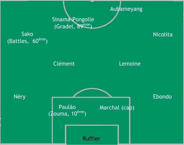 2ème fois que Galette préfère le 4-4-2 au 4-5-1 avec Sinama-Pongolle dans un rôle de 9,5 légèrement plus décroché qu’Aubameyang qui évoluera juste devant lui. Sinon, derrière, Ghoulam remplace Néry qui avait été plus que moyen lors de ses dernières sorties. Guilavogui est suspendu donc on retrouve Clément aux côtés de Lemoine dans un milieu associant toujours le 6 pur et le milieu relayeur. 3ème titularisation de suite pour Nicolita qui commence doucement mais sûrement à faire son trou dans cette équipe. Kitambala est pas prêt de redevenir titulaire. Sinon, pour la deuxième fois de suite, on perd un défenseur central sur blessure en 1ère mi-temps, et 2ème rentrée de suite pour le jeune Zouma.