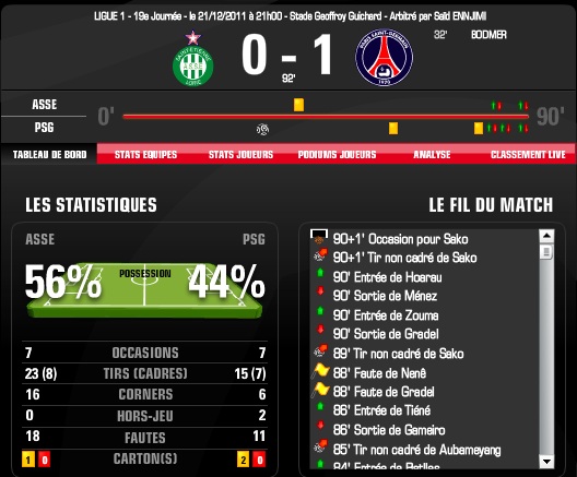 Le bilan est équilibré avec autant d’occasions pour les 2 équipes, mais plus de tirs chez les Verts. On remarque le nombre impressionnant de corners qu’a obtenu l’ASSE (16), mais avec quasiment 3 fois moins de « coups de pied de coin » (© Jean-Michel Larqué), c’est le PSG qui marque sur ce type d’action. Je n’ai pas réussi à trouver le nombre de centres que les Verts ont envoyé vers les cages de Sirigu, mais là aussi on doit frôler un record. Malheureusement, aucun n’a réussi à être décisif.