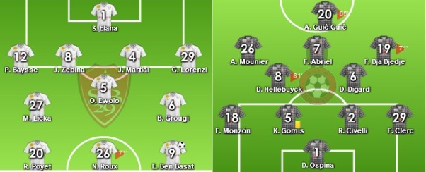 Roux est sorti pour Ba, qui galère face à Civelli, Mr Gautier siffle une faute, Renato proteste, regarde son gardien, et David Ospina du chef pour conforter son défenseur.