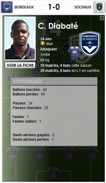 Diabaté (1/5) : Mal placé (le mec fait 2 mètres 12 de haut et reste aux 20 mètres sur les centres), inefficace (aucune occasion), inutile (Peybernes en rigole encore de son duel avec Cheick). Vas apprendre ce que c’est d’être avant-centre. Ou signe à Blackburn pour 10M€. Remplacé par Modeste à la 64ème.