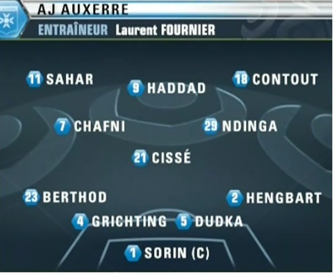 C’est clairement la première solution qui transparait. « Auxerre a peur ». Au milieu retour de Doudou « Tout va bien » Cissé. Souriant avant le match, heureux de voir son équipe remuer dans la merde. Bref  le bonheur quoi. Candidat au ballon d’eau fraîche. Oui il est sympa et plutôt pas con mais bon… « Il va falloir se battre » disait-il au micro de Foot+ avant le match. Il ne croyait pas si bien dire… Derrière le Damien Traille des footballeurs Darius Dudka occupe la charnière en compagnie de Stephane Grichting. Trop bon lors des deux précédents matchs, Segbefia est sur le banc. Faudrait pas qu’il prenne confiance non mais oh ! Devant Sahar auteur d’un bon petit match face à Nice est reconduit. Contout fait son entrée après celle réussie également contre Nice.