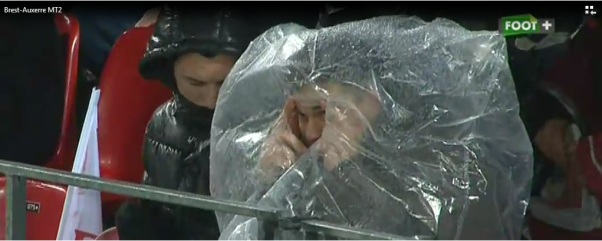 A noter la belle minute de silence en l’honneur d’un supporter brestois décédé en mer. Ca fait un peu cliché mais c’est beau. Ce stade de Brest me plait pas mal. Noter aussi le temps relativement clément au début du match, moins par la suite. Ca aussi c’est cliché.