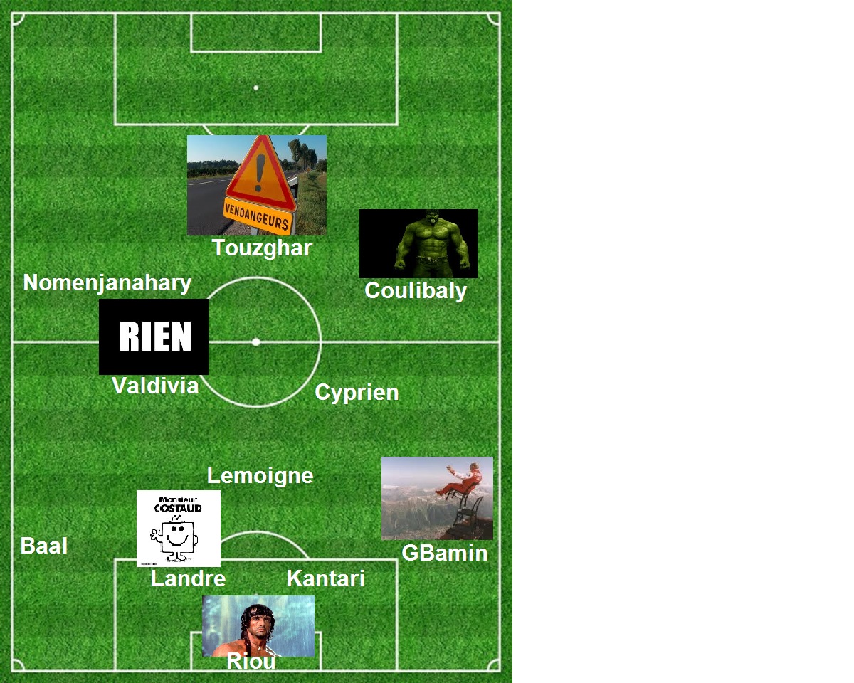 Pourtant, vu notre effectif, c’était pas gagné. AK nous sort en effet tout ce qui ressemble de près ou de loin à un joueur valide : Yahia toujours sur le flanc, c’est notre duo Kantari – Landre qui occupe l’axe, devant un Riou reconduit dans les bois. GBamin et Baal sur les côtés, Lemoigne-Valdivia dans l’axe, les 2 mauvais chevelus Nomenjanahary et Cyprien sur les ailes et devant un combo »vitesse-puissance » Touzghar-Coulibaly.