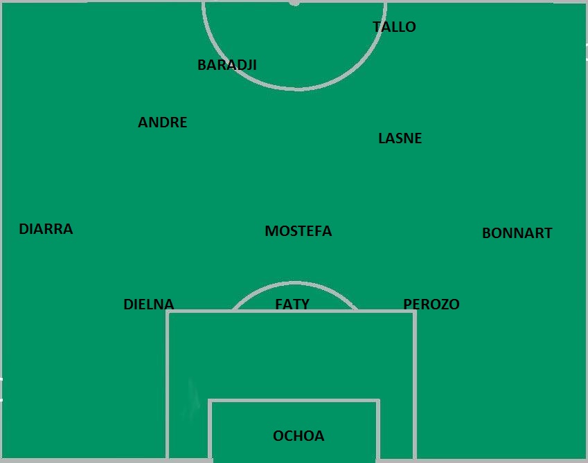 Pour cela, Christian Bracconi avait concocté une surprise de taille : son équipe allait jouer à deux attaquants. Une première depuis les départs de Mutu et d’Eduardo. Ainsi, Baradji et Tallo étaient sur le terrain dès le coup d’envoi. Une première titularisation pour Issa Baradji. Du coup, au milieu, il y a également du changement. Plus de meneur de jeu mais un milieu à trois à vocation défensive avec Mostefa en sentinelle et Benjamin André et Paul Lasne à ses côtés. En défense, c’est toujours la même chose. Ricardo Faty est défenseur central avec Perozo à droite et Dielna à gauche. Les postes de latéraux sont pourvus par Sigamary Diarra et Laurent Bonnart.