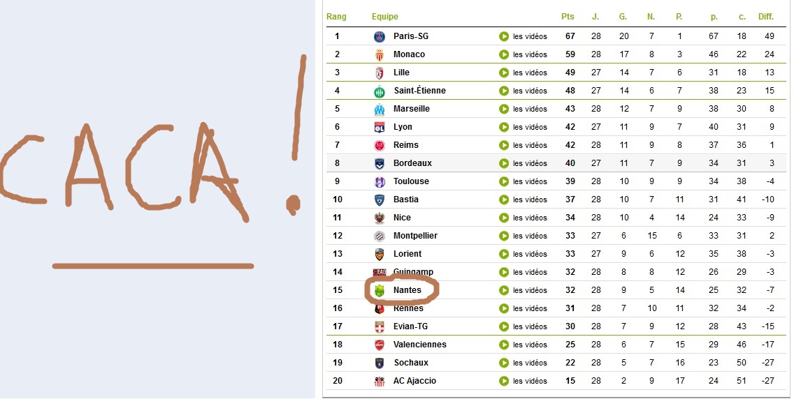 Nantes – Rennes (0-3) : La Breizhou Académie s’est régalé, avant de déchanter dans la foulée face à Guingamp et Valenciennes. Public, palmarès, culture de la lose, tout ça… Du coup ils sont derrière nous au classement ces apôtres : si Rennes recule et que Nantes recule, comme veux-tu que l’on… ? Pas grand-chose à dire sur ce match, on ne l’a pas joué. Rendez-vous l’année prochaine. Ou pas. Si Rennes pouvait descendre en ayant posé 8-9 millions sur son mercato hivernal, un rêve de gosse se réaliserait pour Raynald.