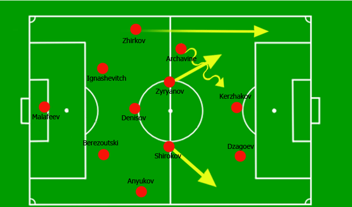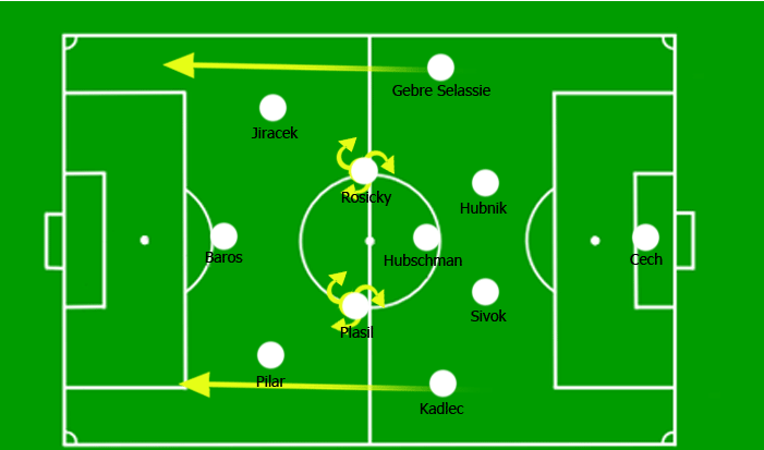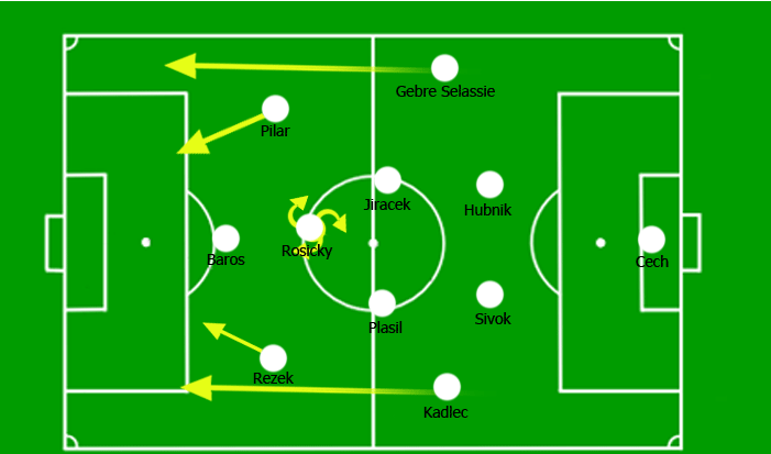 …pour la République Tchèque de Bilek avec paire de récupérateurs, meneur axial, impact player aux duels et latérailiers dans les couloirs. Ca coulisse, ça permute, se replie, chaque ouvrier spécialisé couvre sa zone et s’applique. Las! L’organisation du travail par division et spécialisation des tâches a vécu et l’avènement des formes « totalisantes » venues des Pays-Bas ou de Catalogne les rend toujours plus obsolètes. Passées les dix minutes de pré-chauffage de la machine, le 433 russe débute son processus d’autopoïèse et l’OS tchèque panique. Capitaine, Archavine donne signal et direction aux manoeuvres, la présence de Zhirkov dans son couloir le dispensant de l’occuper réellement. Ainsi, la relance passe par la gauche afin de trouver rapidement le guide tandis qu’à l’opposé, Kerzhakov-Dagoev forment une paire d’attaquants décentrée. Le dispositif s’anime au gré des chevauchés de Archavine, les attaquants se proposent au rebond et le duo Shirokov-Zyryanov plonge qui dans les couloirs, qui dans la surface. Certes collective, la force russe réside surtout dans ces déferlantes que seule régit la loi du surnombre. Ainsi, le débordement-centre couloir droit qui amène le but n’est ni l’œuvre de Anyukov, ni celle de Dagoev mais bien le fait de Zyryanov qui trouve la tête de Kerzhakov, poteau, finition de Dagoev: 1-0, 14ème. 4 minutes plus tard, chevauchée couloir gauche de Archavine et le ballon de transiter par Kerzhakov jusqu’à Dagoev. L’architecture « totale » se dessine à mesure que Archavine intègre l’axe et décale Shirokov: 2-0, 23ème. Et tandis que la machine à vague russe s’apaise, la mécanique tchèque n’a que centres (30ème) et ouvertures longues (36ème) à opposer.