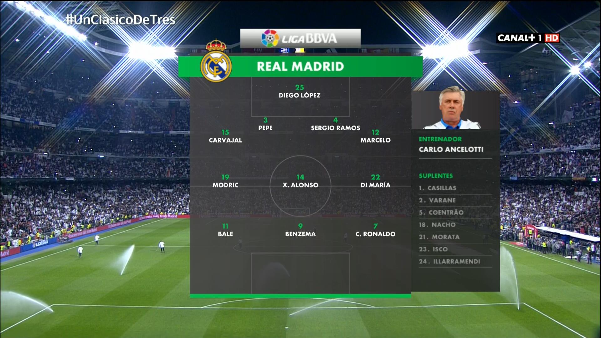 Le Real fait face à quelques blessures, notamment celle, très grave, de la révélation Jesé, mais pas de problème chez les titulaires, c’est donc la vrai équipe type de Madrid qui se présente sur la pelouse. Une équipe qui a mis un peu de temps à se mettre en place mais qui dans sa configuration actuelle, est devenue une machine de guerre.