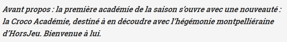En reprenant l’acad’ en cours de saison, le dévoué serviteur de l’institution que je suis a récupéré l’appellation existante, pépouze, sans se poser davantage de questions. Il se trouve qu’en ce début d’année, une petite exploration des archives d’Horsjeu.net m’a permis de constater que le lancement officiel de l’acad’ nîmoise, en 2012 messieurs-dames (foutre, à l’époque notre capitaine c’était Benoît Poulain, un bien bel homme), s’était fait sous le nom plus compréhensible de « Croco Académie », le doublement du « r » n’étant intervenu que plus tard. Pour les nostalgiques aussi bien que pour les novices, on notera que l’objectif de l’acad’ était simple, noble, et assumé d’entrée :